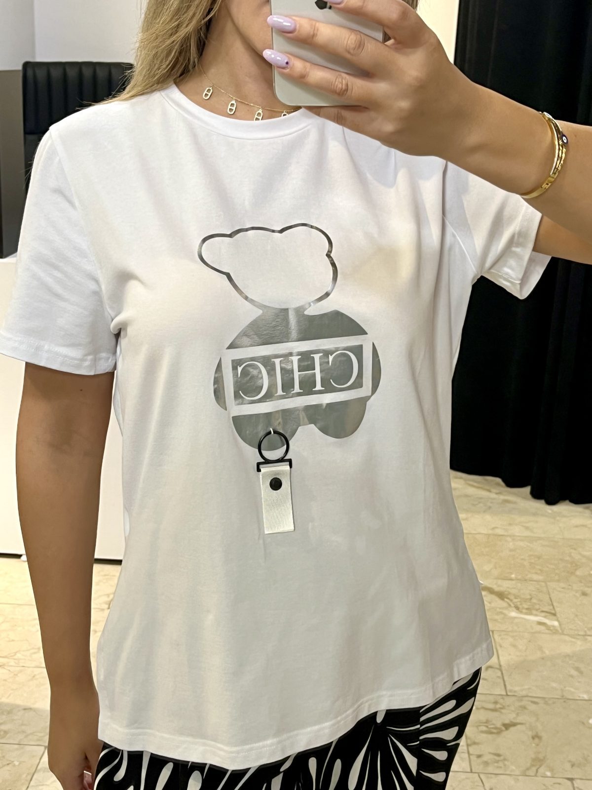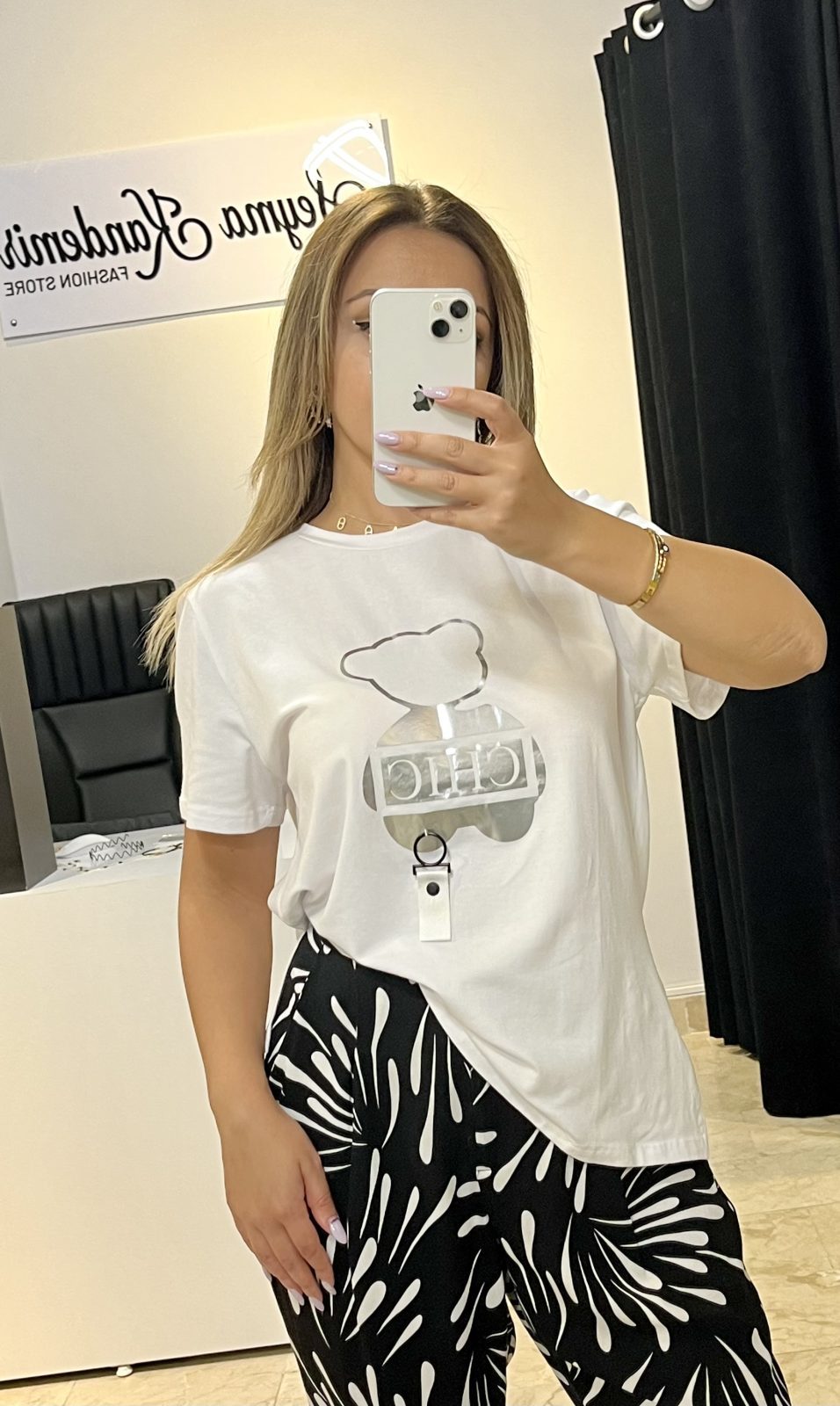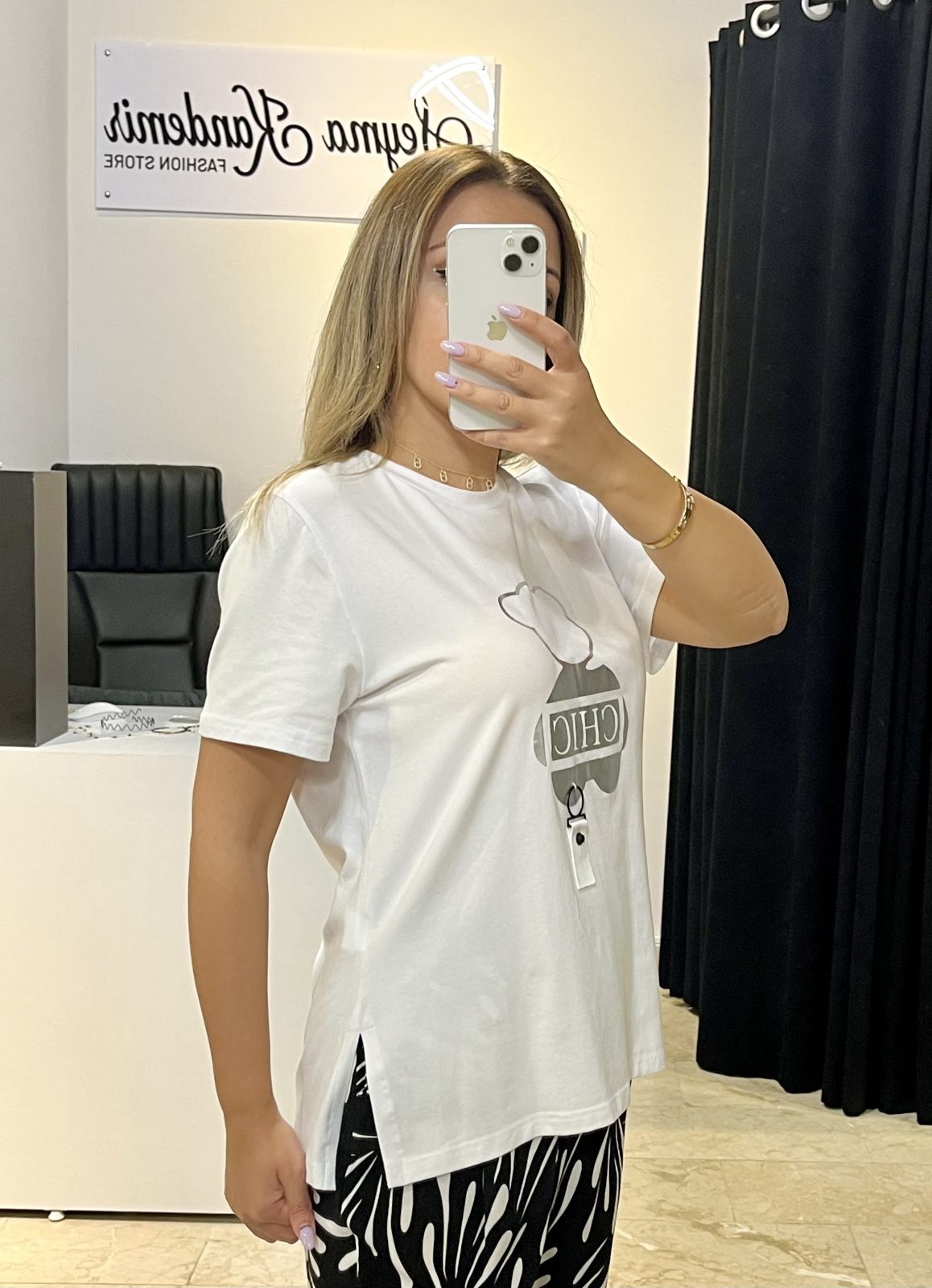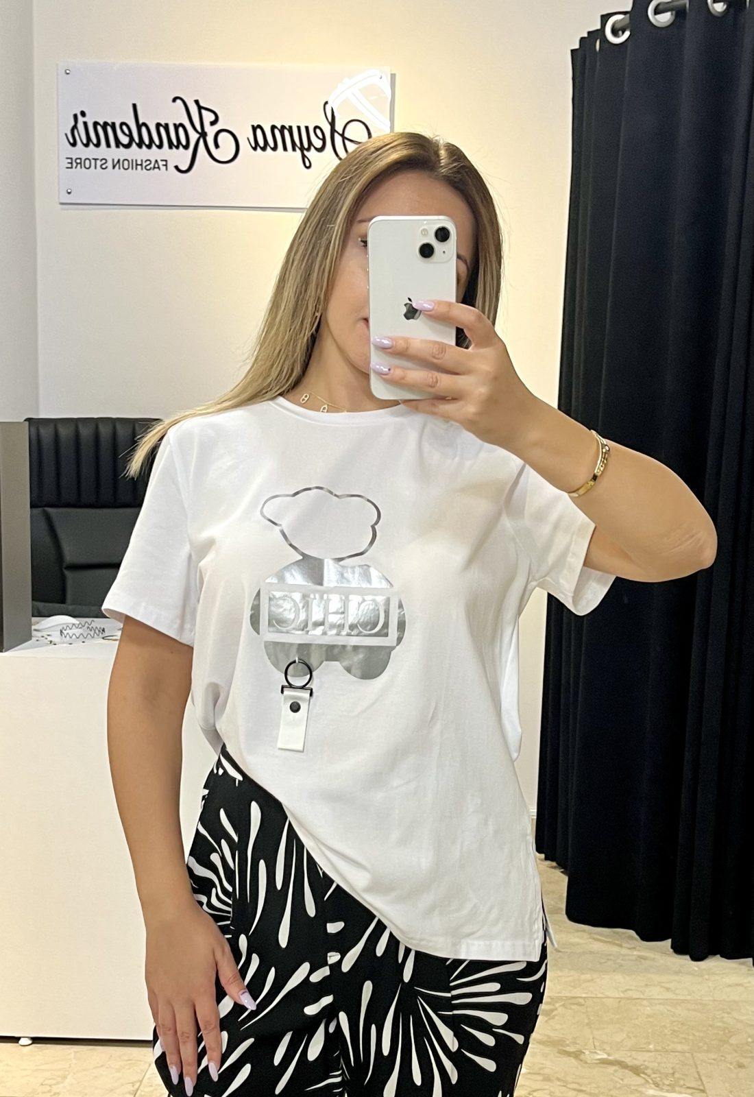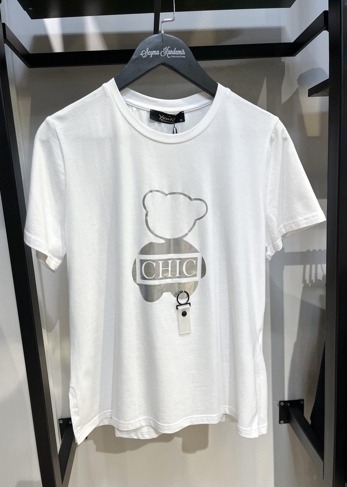 Beyaz Yuvarlak Yaka Baskı Detaylı Tişört