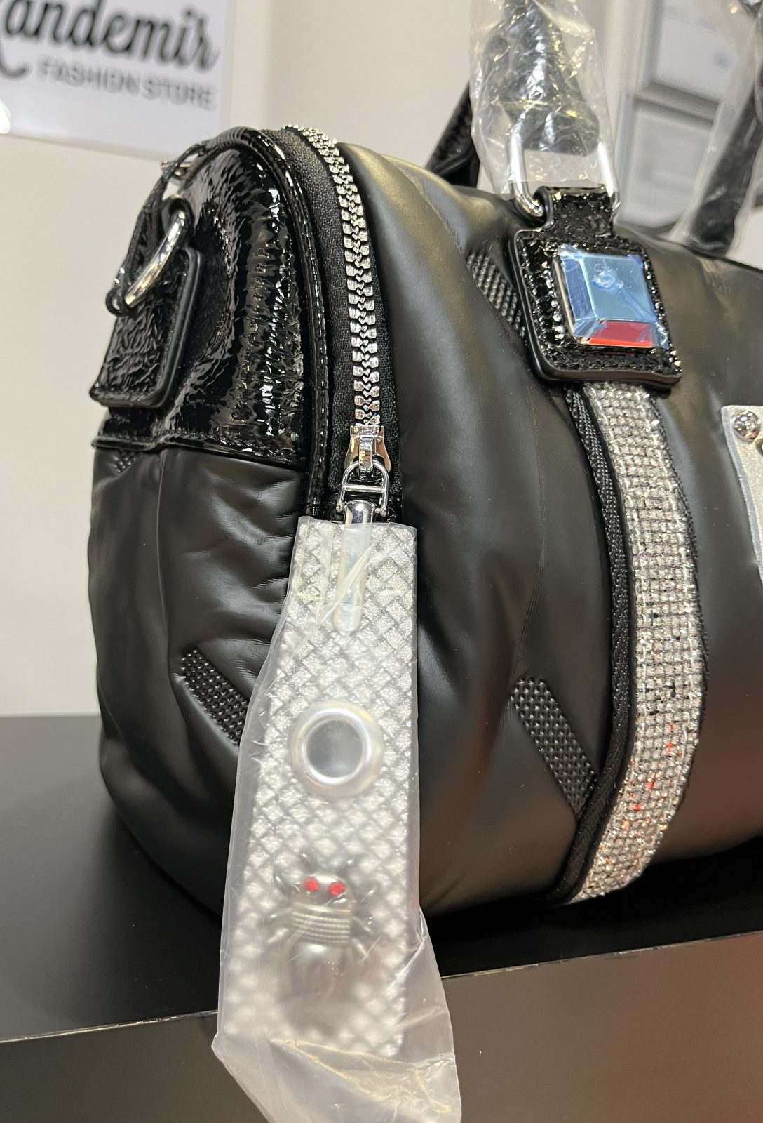 Siyah Şerit Taş Detaylı El ve Omuz Çantası
