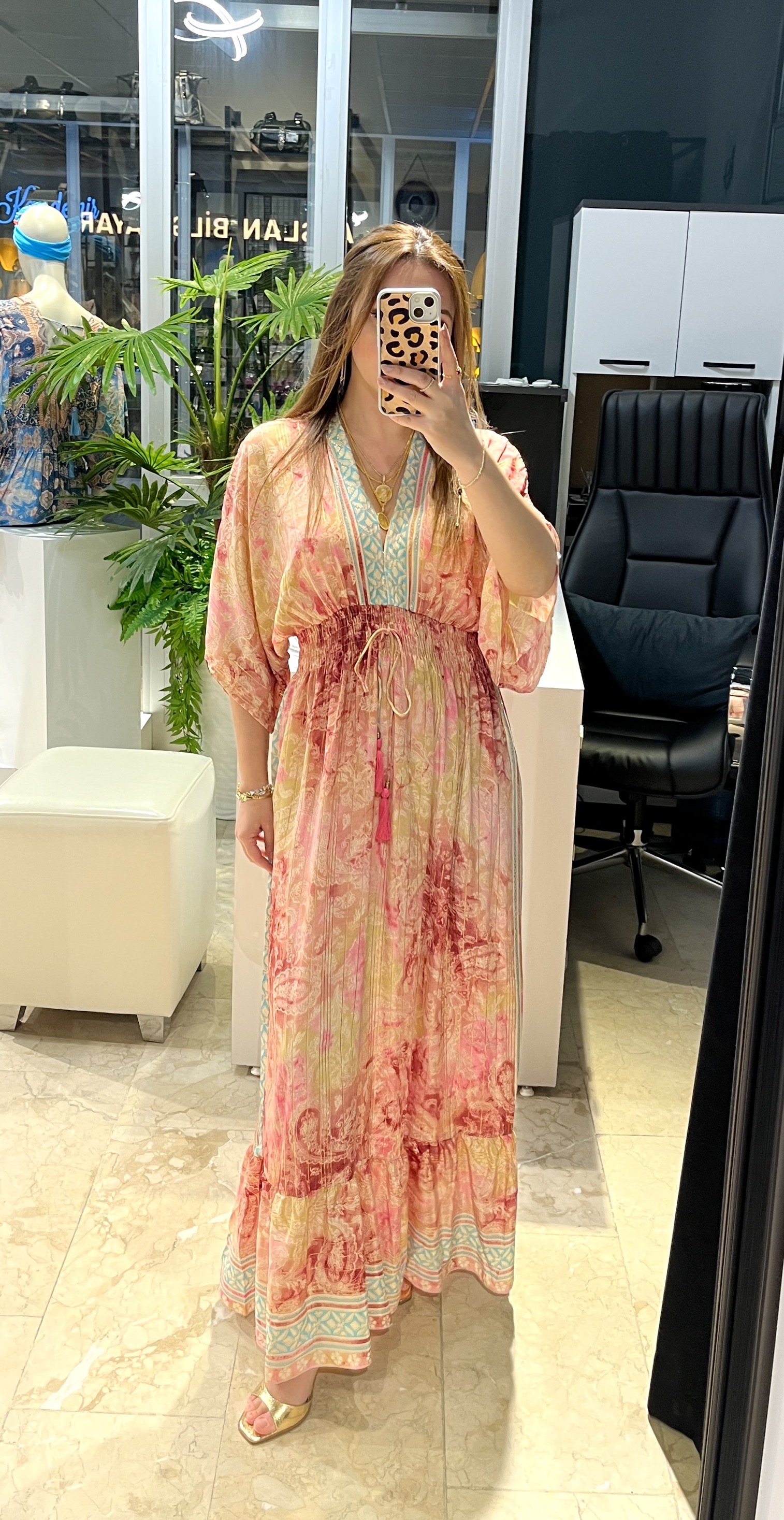 Pembe Beli Lastikli Uzun İpek Elbise