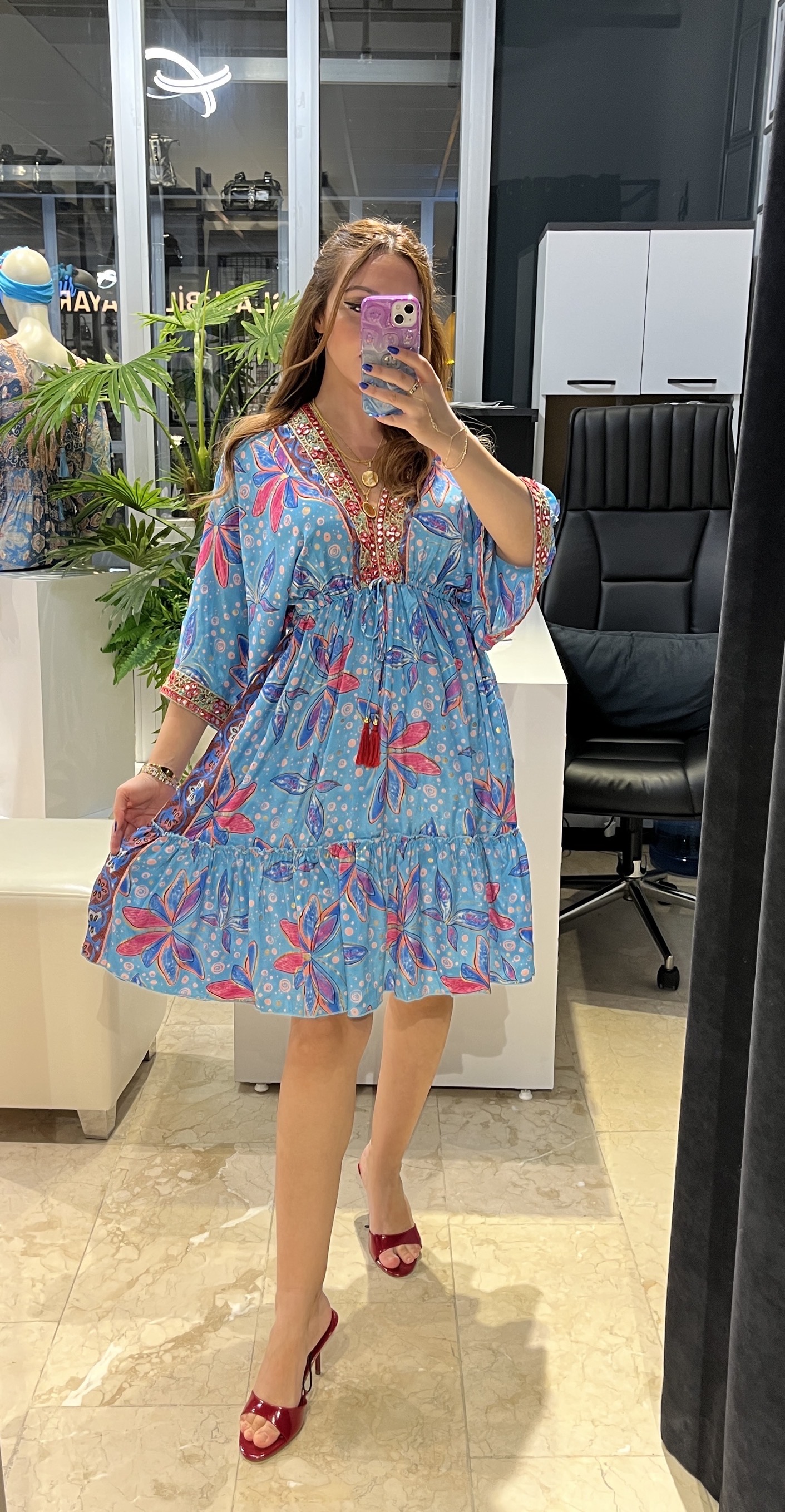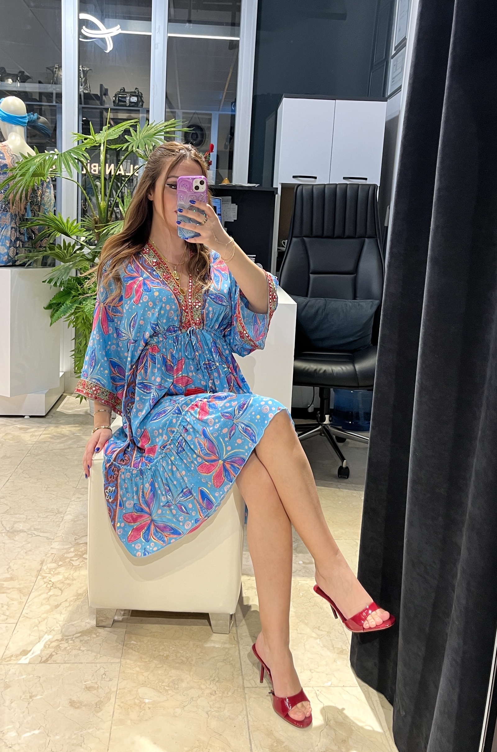 Çiçekli V Yaka Beli Lastikli İpek Elbise
