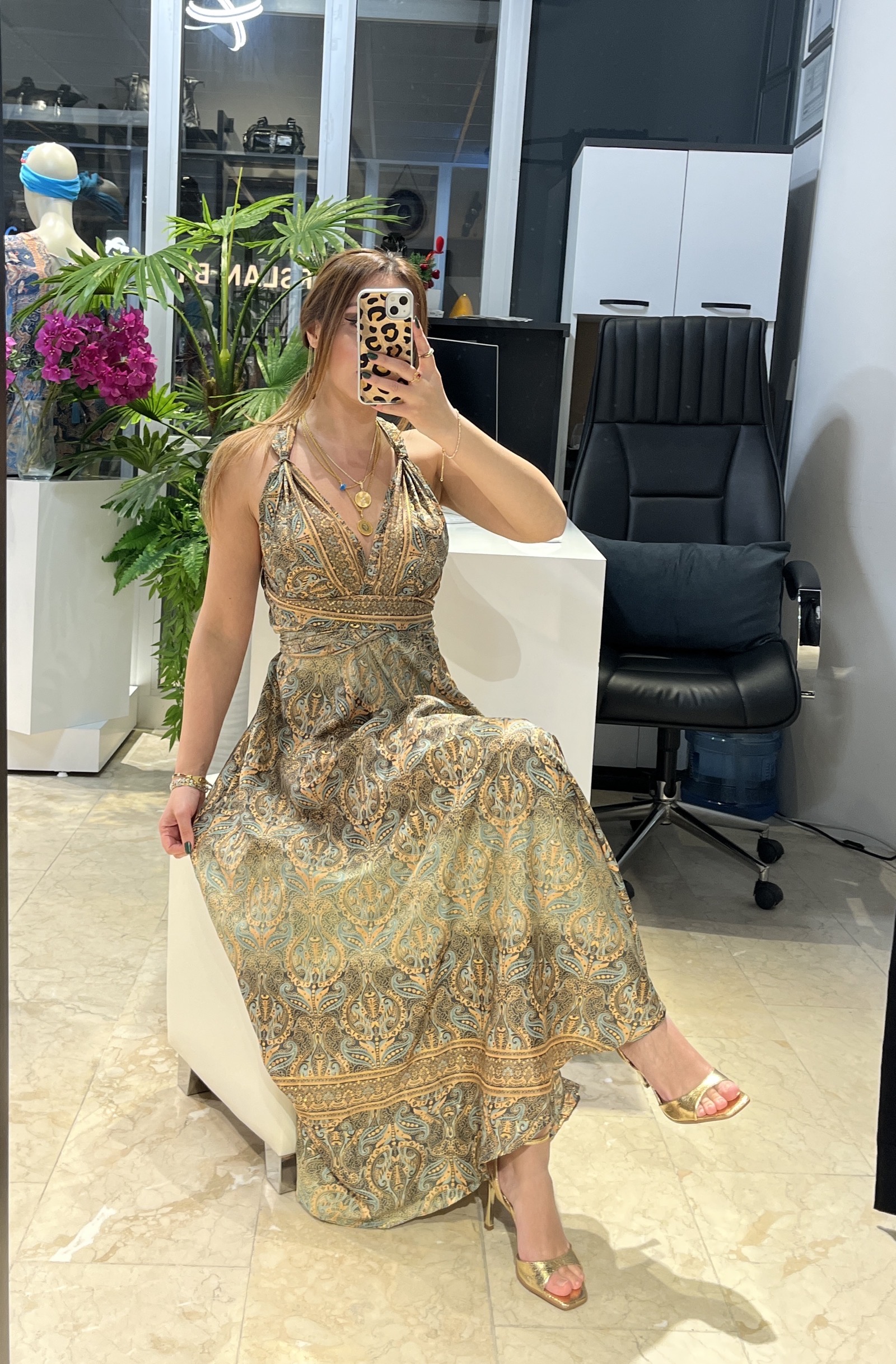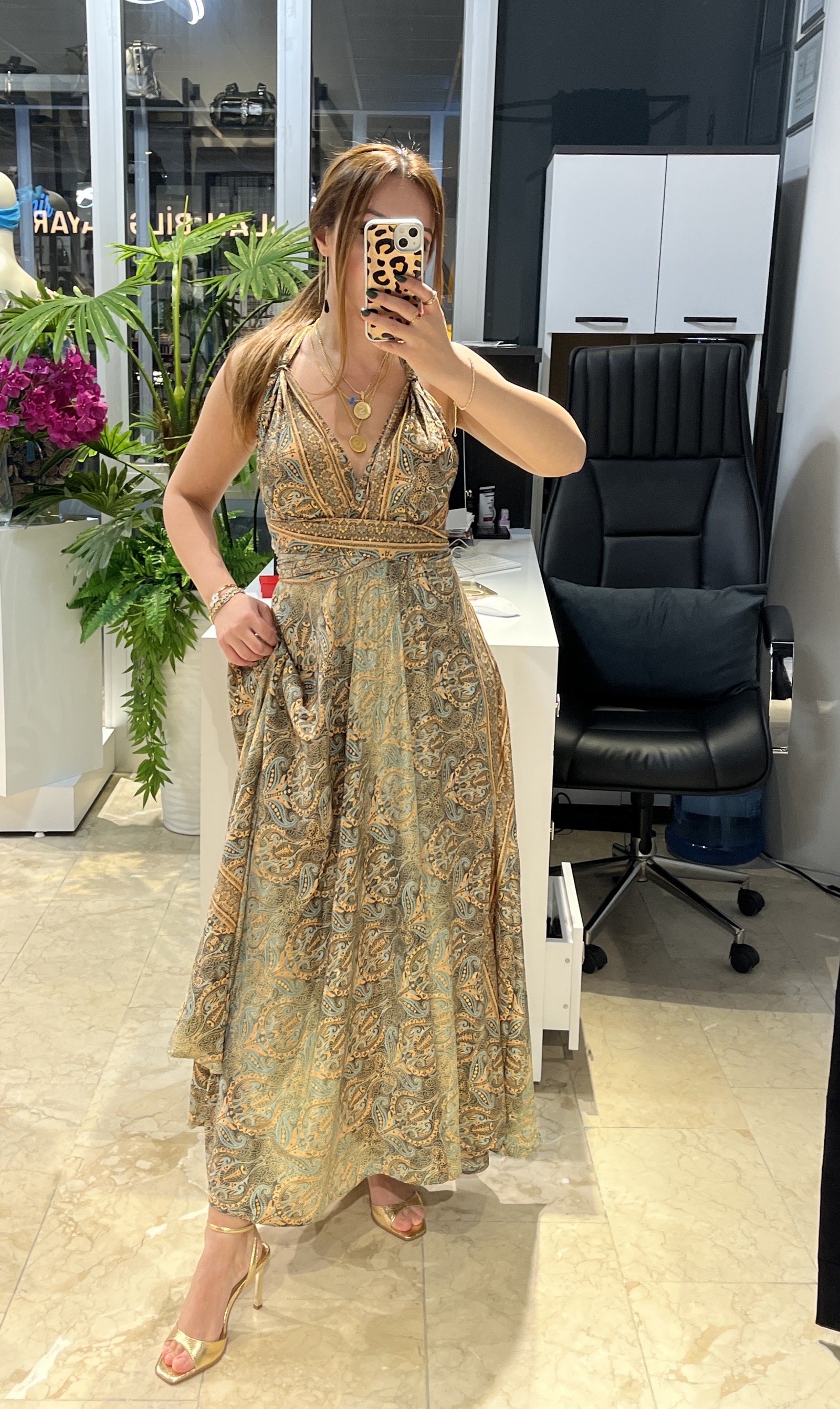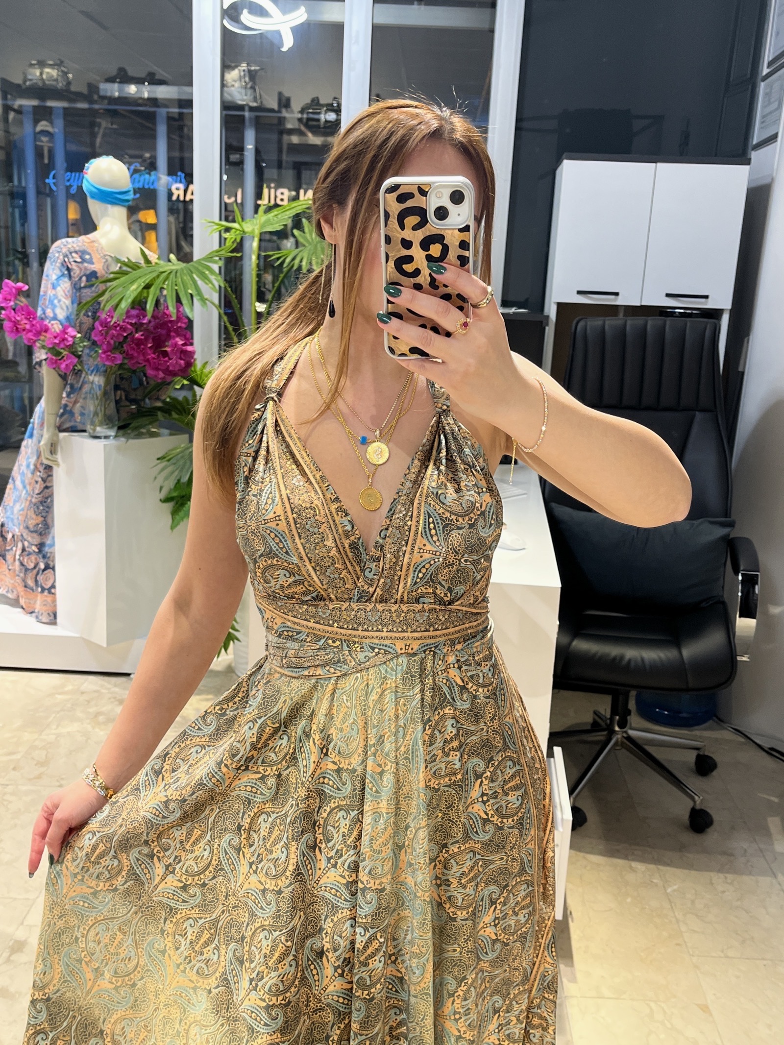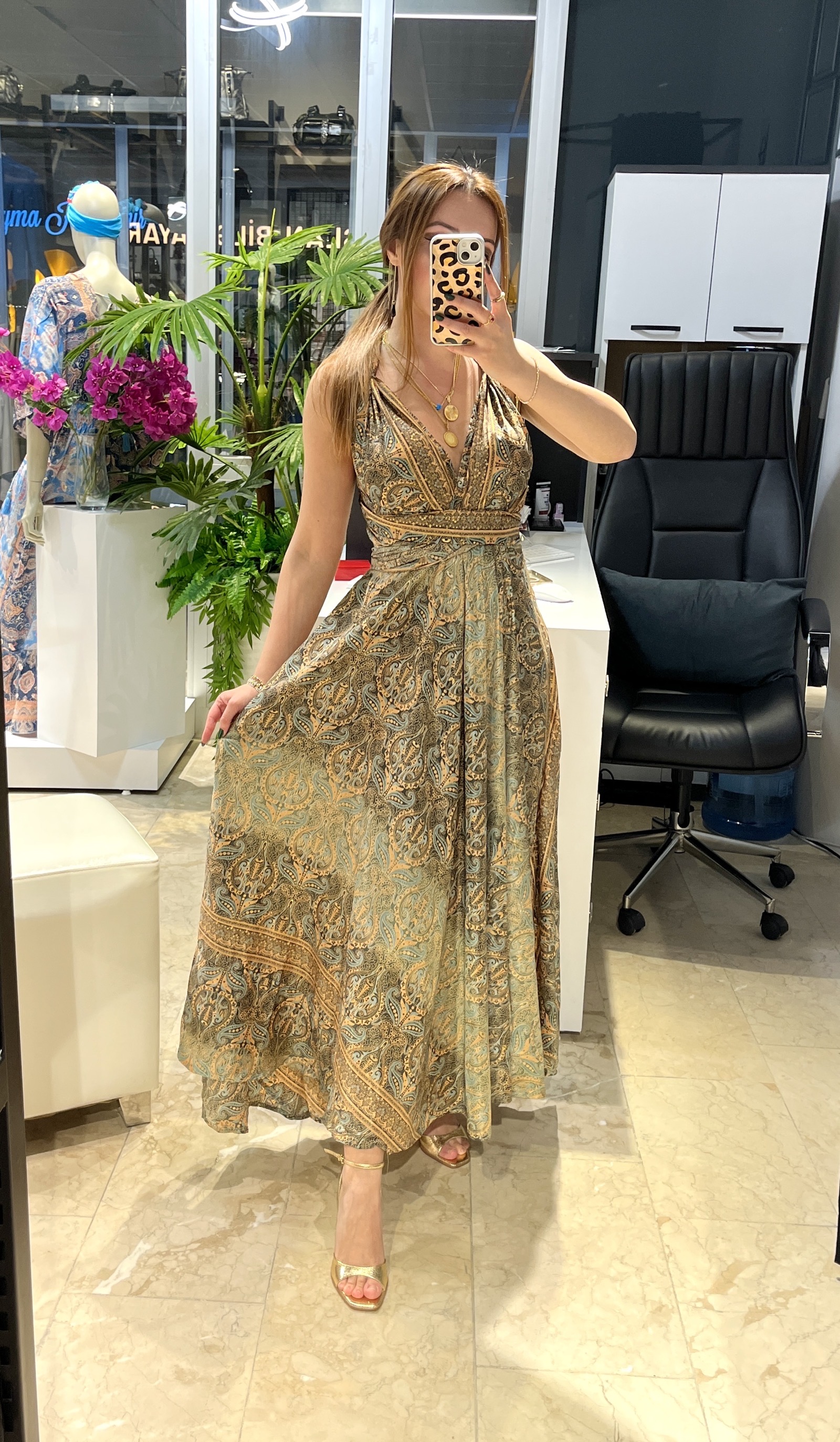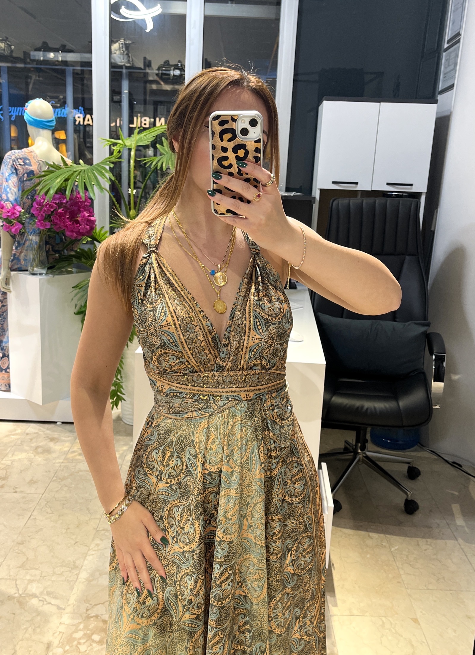 Koyu Yeşil Desenli Bağlama Detaylı İpek Elbise