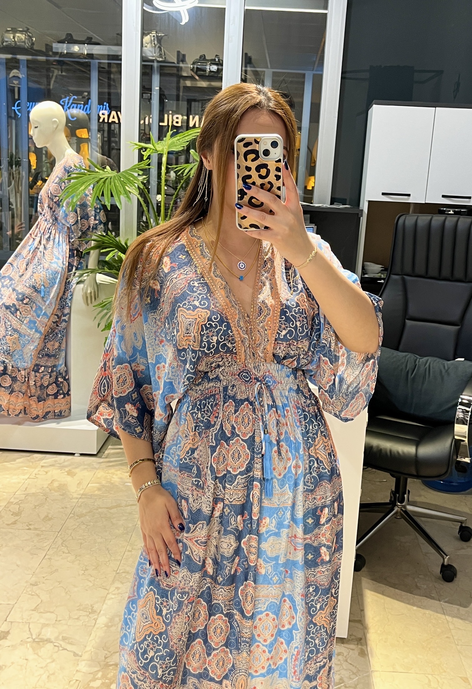 V Yaka Etnik Desenli Bohem Maxi Elbise